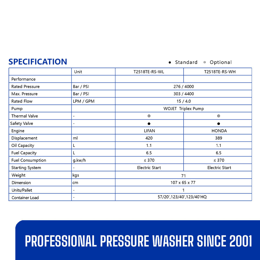 | Rated Pressure | Bar / PSI | 276/4000 | |