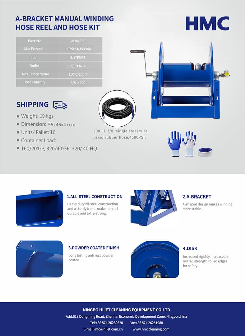 The HMC High Pressure Washer Hose Reel supports 350Bar pressure with a 200ft hose capacity, made of durable powder-coated steel. It ensures reliable performance for manufacturing plants, featuring a maximum temperature tolerance of 300°F and a robust 1-year warranty. The product is tested rigorously with provided machinery test reports and video outgoing-inspection for quality assurance.